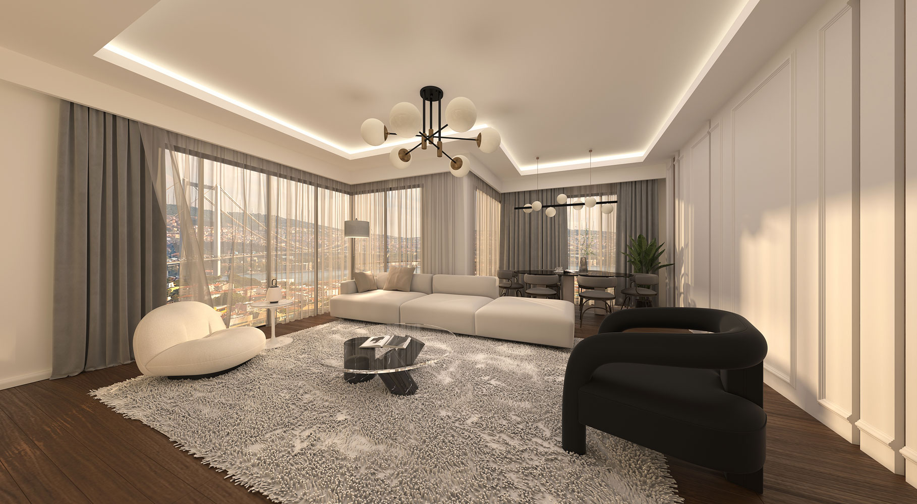 Nestled in the heart of Hanem Konakları Residences in Üsküdar, Istanbul, lies a breathtaking 3+1 apartment that our studio had the pleasure of designing. The apartment boasts stunning panoramic views of the Bosphorus, and we wanted to ensure that the interior design was just as impressive.